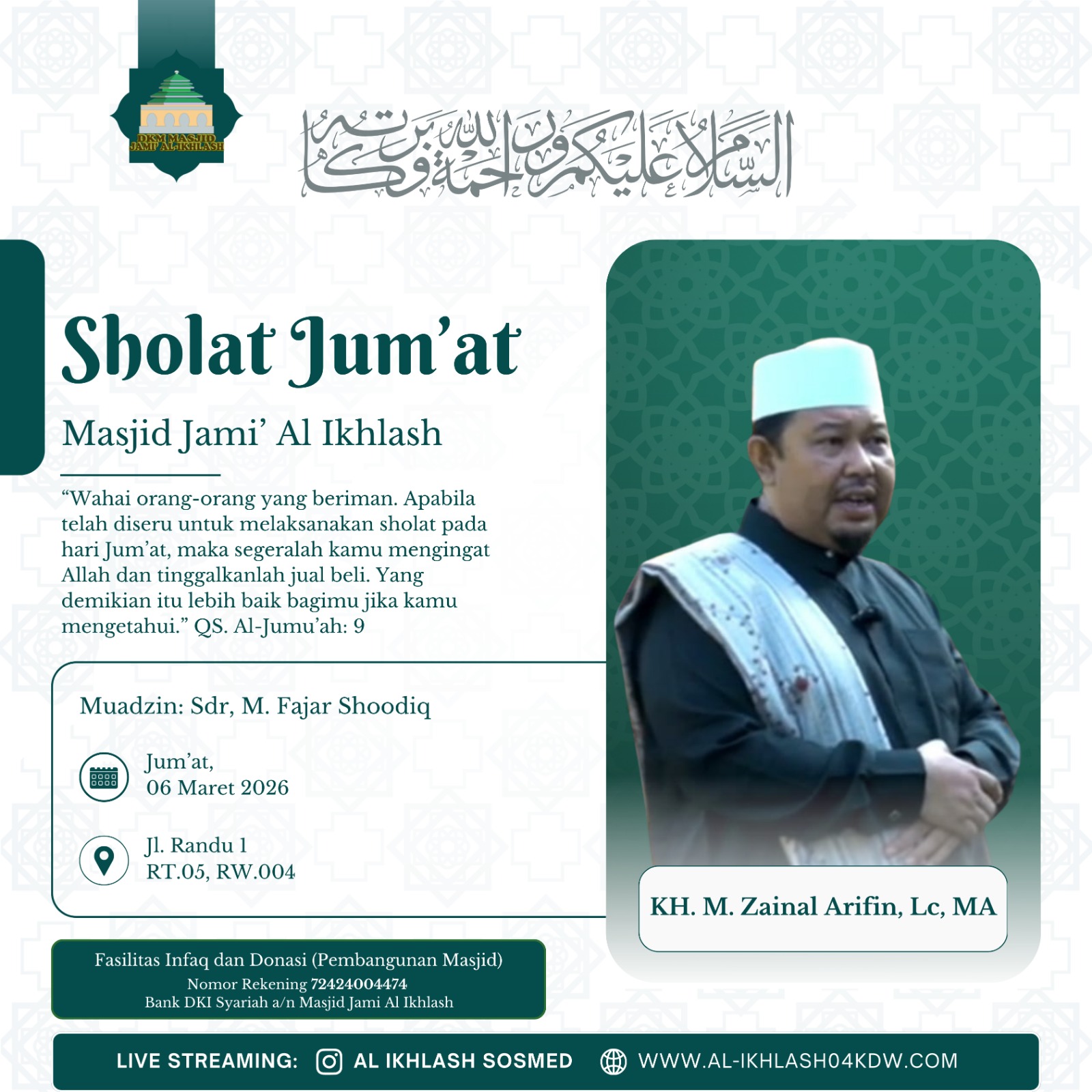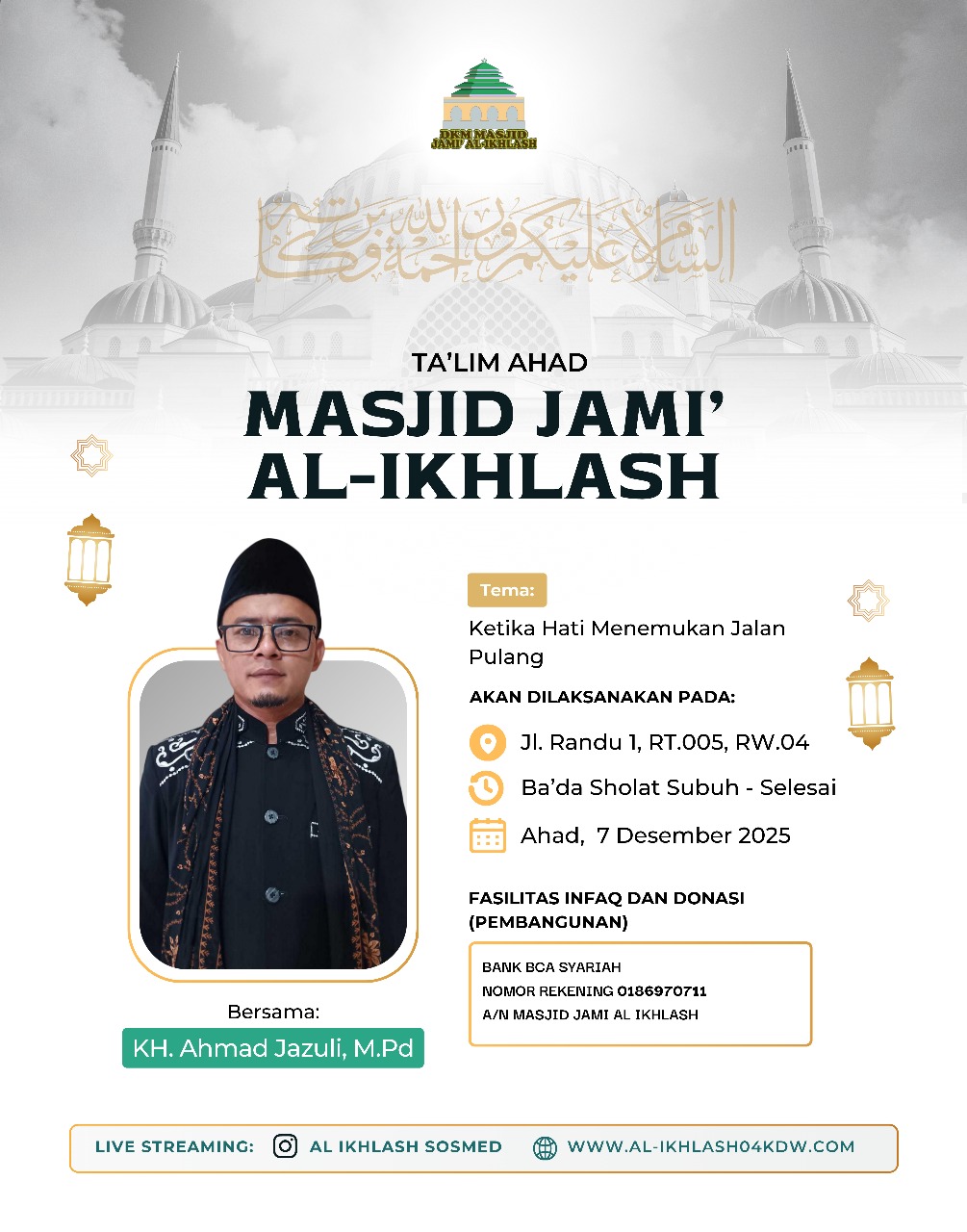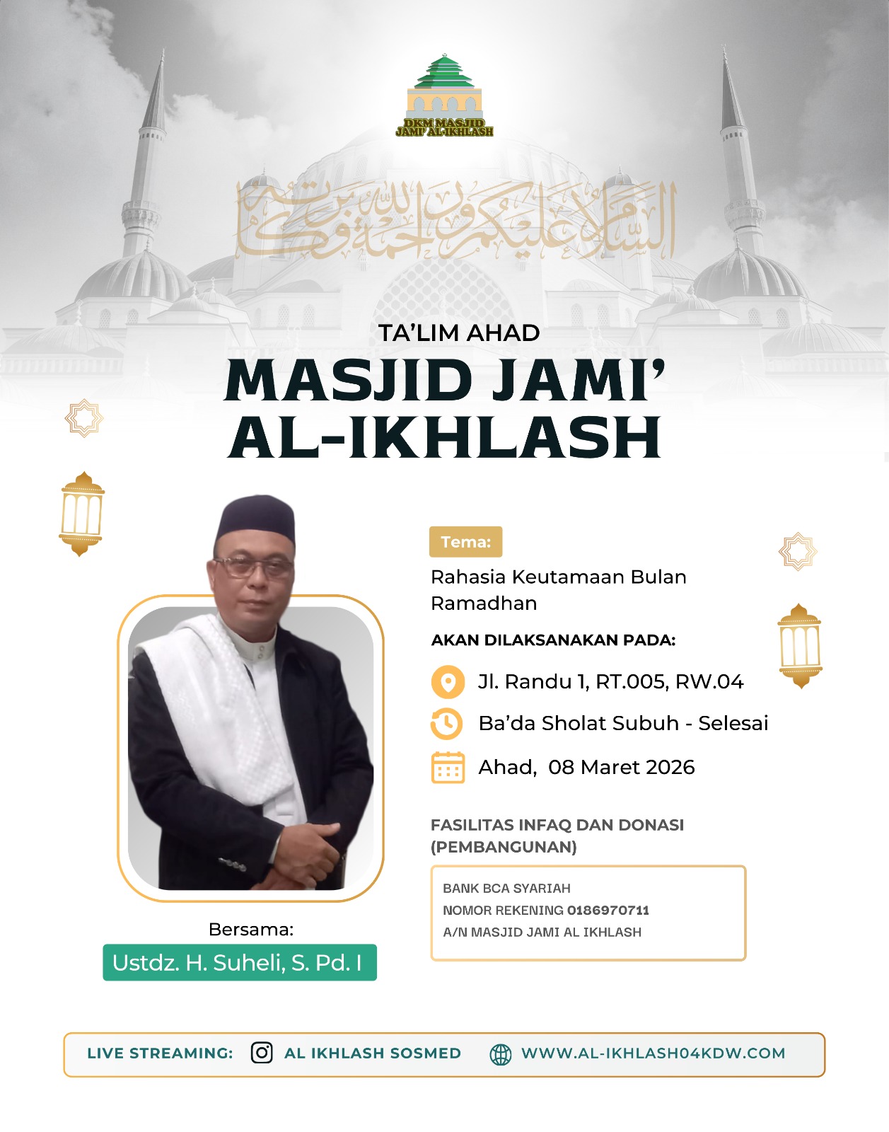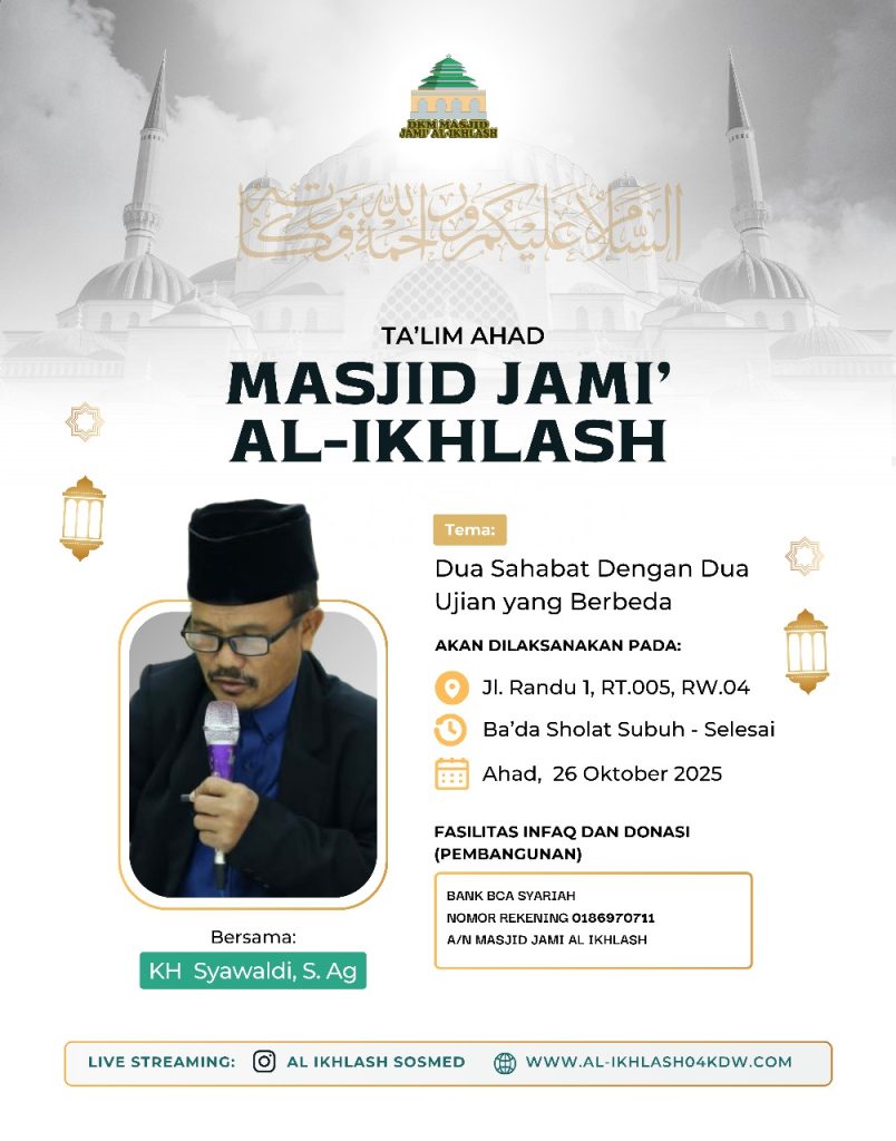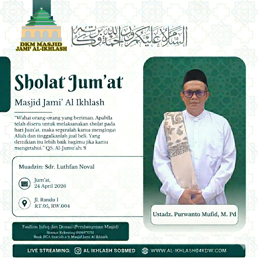 al-ikhlash04kdw.com adalah website dari Masjid Jami Al-Ikhlash, yang terletak di Jalan Usman RT. 005 RW. 004, Kelapa Dua Wetan – Ciracas Jakarta Timur 13730. Dimana masjid ini adalah sebagai wadah tempat pusat ibadah, bermasyarakat dan berfungsi untuk mewujudkan kesejahteraan dan ketertiban sosial melalui kajian-kajian keagamaan. Di dalam masyarakat yang majemuk, seperti Indonesia, maka masjid dapat difungsikan untuk memberikan dakwah yang bersifat menyejukkan dalam praktik kehidupan sehari-hari.