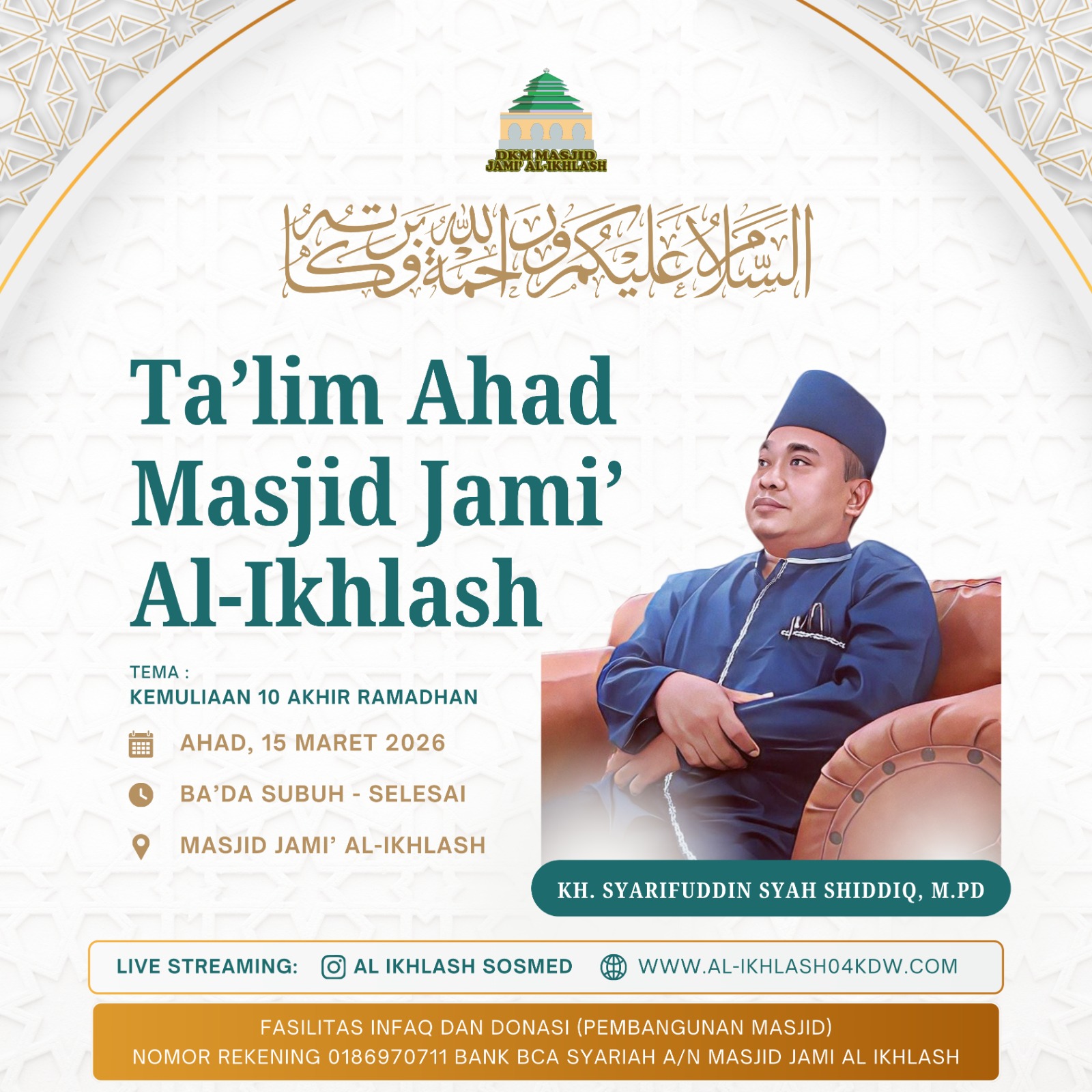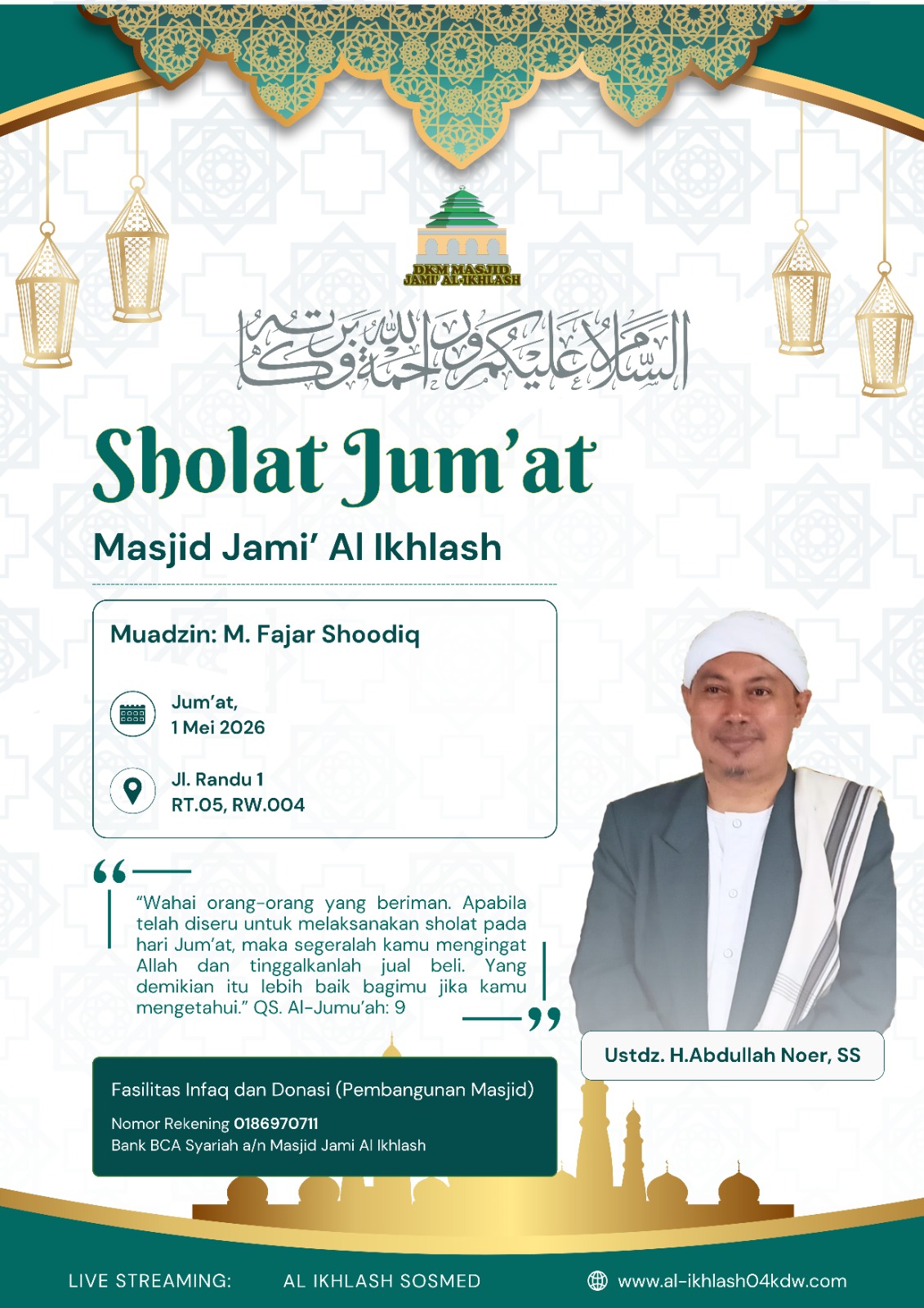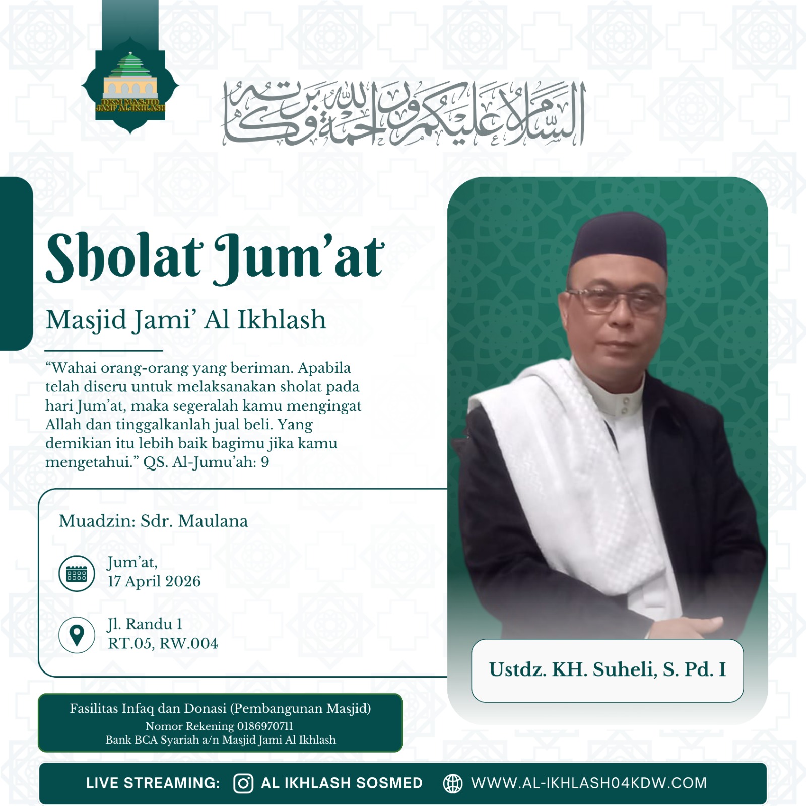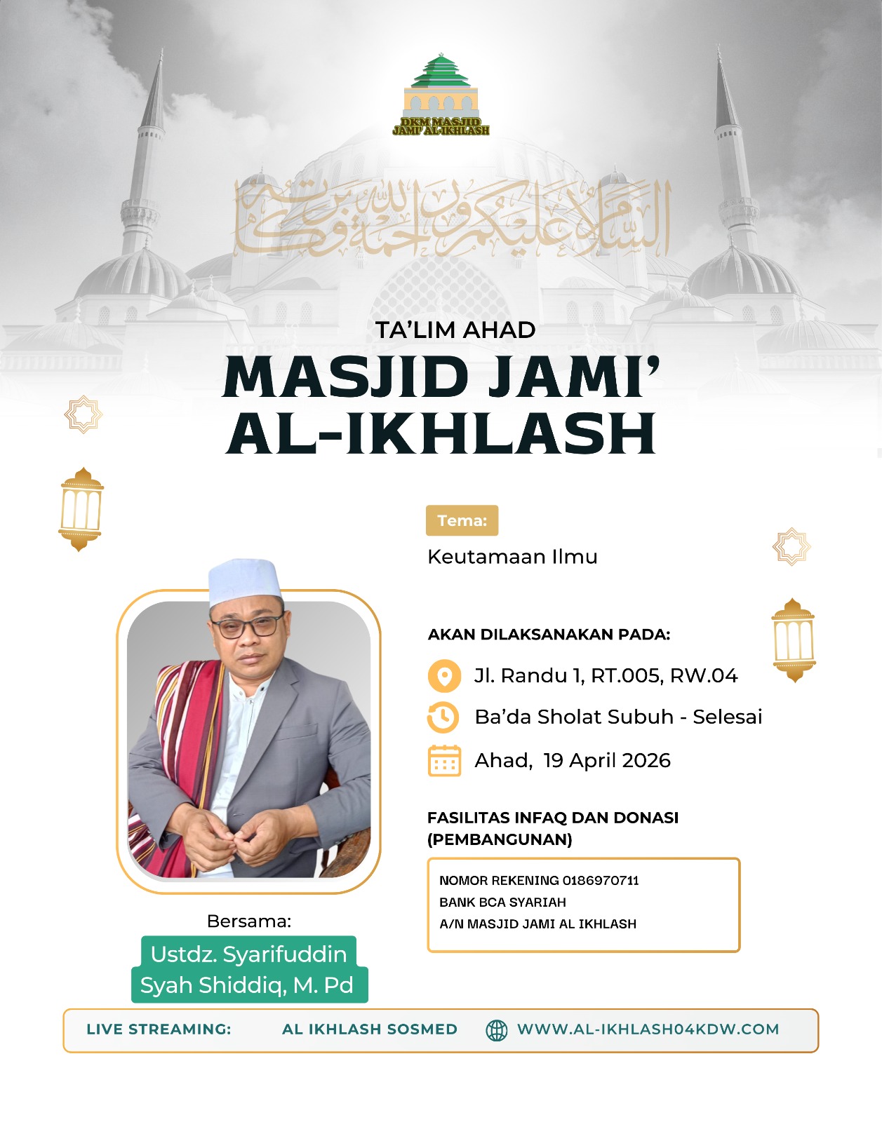 al-ikhlash04kdw.com adalah website dari Masjid Jami Al-Ikhlash, yang terletak di Jalan Usman RT. 005 RW. 004, Kelapa Dua Wetan – Ciracas Jakarta Timur 13730. Dimana masjid ini adalah sebagai wadah tempat pusat ibadah, bermasyarakat dan berfungsi untuk mewujudkan kesejahteraan dan ketertiban sosial melalui kajian-kajian keagamaan. Di dalam masyarakat yang majemuk, seperti Indonesia, maka masjid dapat difungsikan untuk memberikan dakwah yang bersifat menyejukkan dalam praktik kehidupan sehari-hari.