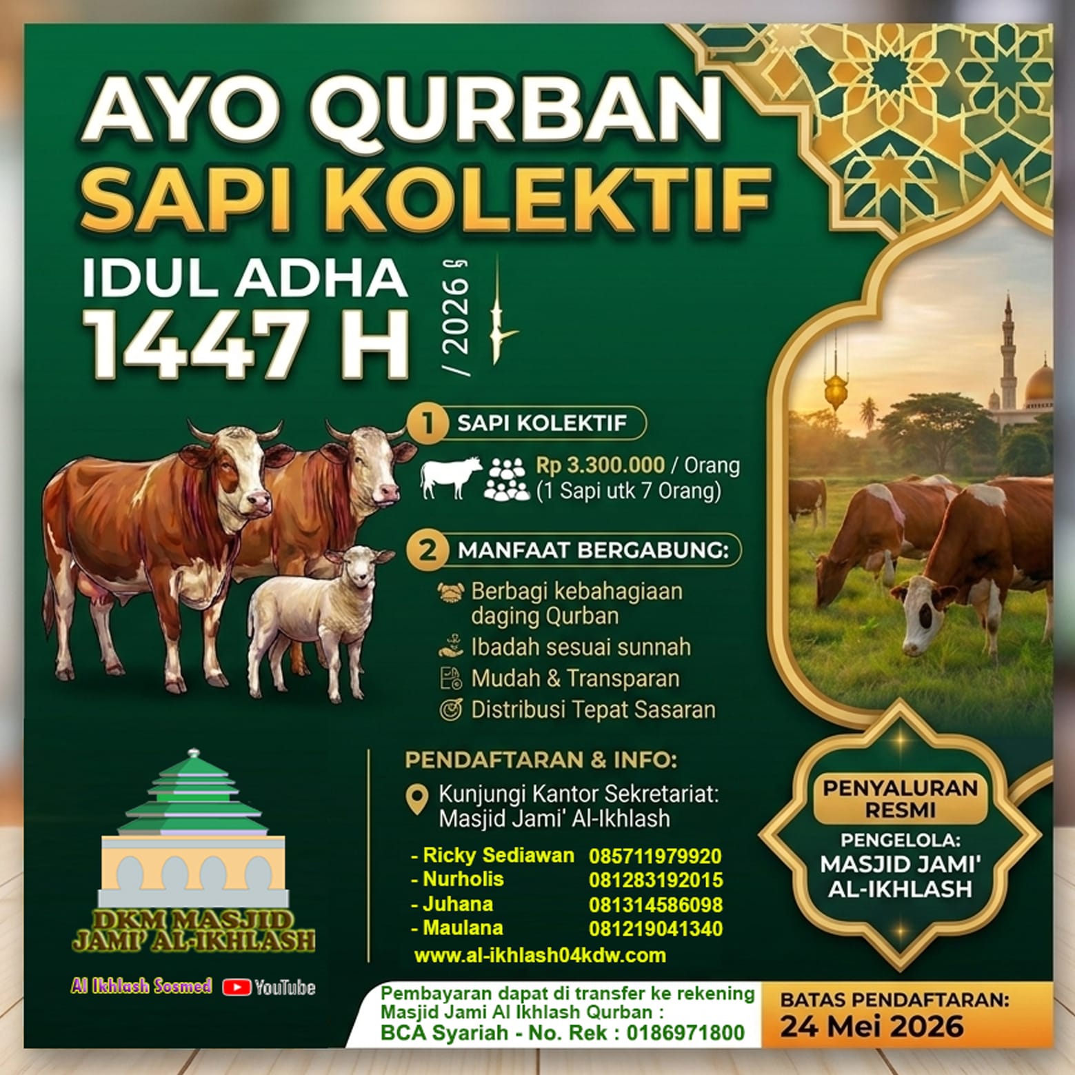 Masjid Al-Ikhlash dalam hal ini memiliki keinginan dan tujuan yang mulia, yaitu ingin ber-TRANSFORMASI demi kemajuan umat ISLAM, seperti dalam hal Sarana-Prasarana, Fasilitas dan Kegiatan. Itu semua adalah harapan kami sebagai jamaah khususnya dan umat ISLAM umumnya, sehingga kita dapat “MEMAKMURKAN MASJID DAN DIMAKMURKAN MASJID”