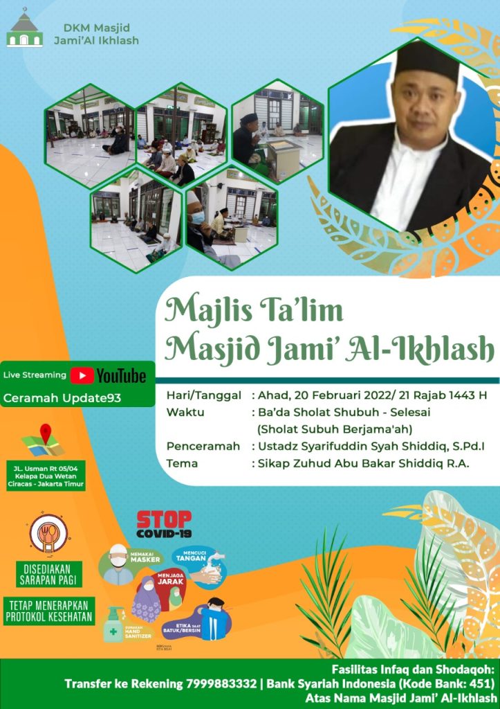 Ta’lim Ahad Ba’da Subuh berjamaah di Masjid Jami’ Al-Ikhlash pada tanggal 20 Februari 2022 diisi oleh Ustadz Syarifudin Syah Shiddiq, S.Pd.I dengan Tema “Sikap Zuhud Abu Bakar Shiddiq R.A”.