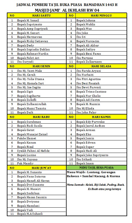 Marhaban Ya Ramadhan…kami segenap pengurus Masjid Jami’ Al-Ikhlash Mohon maaf lahir bathin dan mengucapkan selamat menunaikan ibadah puasa Ramadhan 1443 H. Di bawah ini adalah jadwal pemberi Ta’jil Masjid jami’ Al-ikhlash :