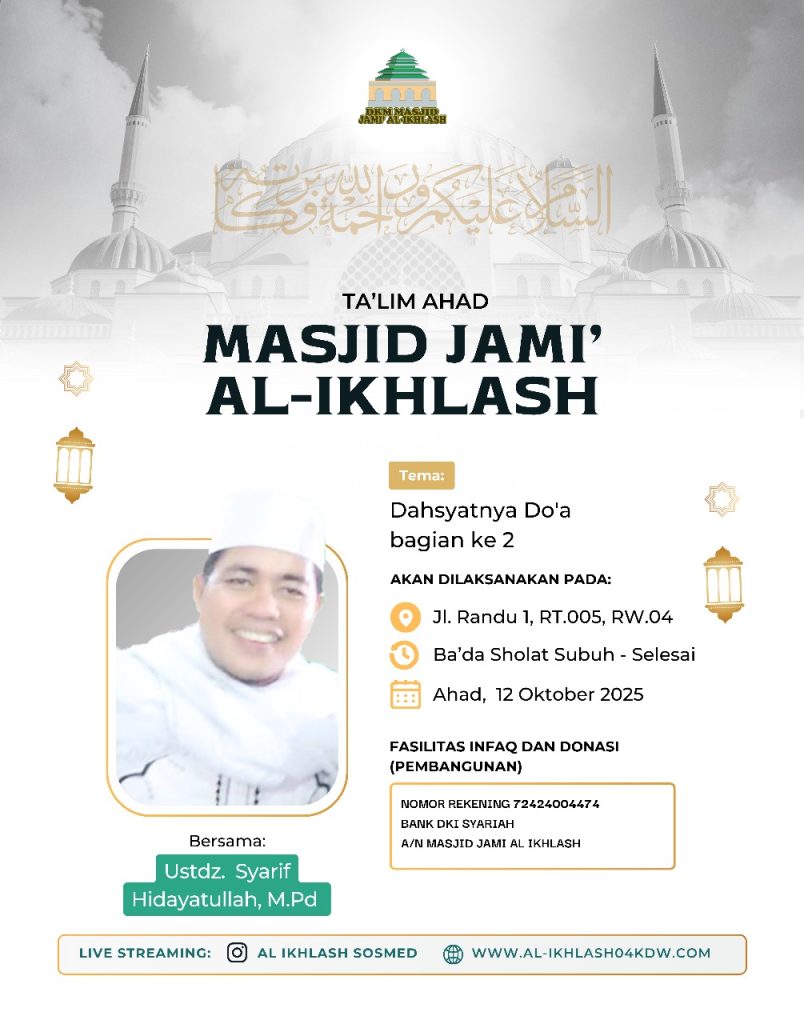 Ta’lim Ahad Ba’da Subuh berjamaah di Masjid Jami’ Al-Ikhlash pada tanggal 20 Februari 2022 diisi oleh Ustadz Syarifudin Syah Shiddiq, S.Pd.I dengan Tema "Sikap Zuhud Abu Bakar Shiddiq R.A". Dalam…