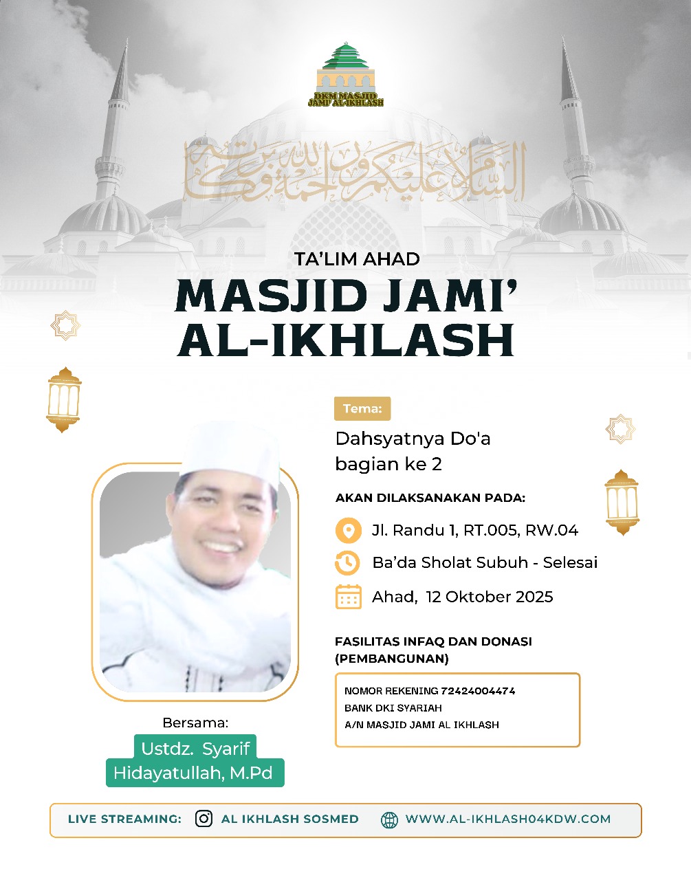 Ta'lim Ahad Ba'da Subuh berjamaah di masjid Jami' Al-Ikhlash pada tanggal 2 Februari 2022 diisi oleh Ustad Syeikh Fahmi Abdul Mughni Al Hafidz dengan Tema Kajian Kitab Mukhtarul Hadist